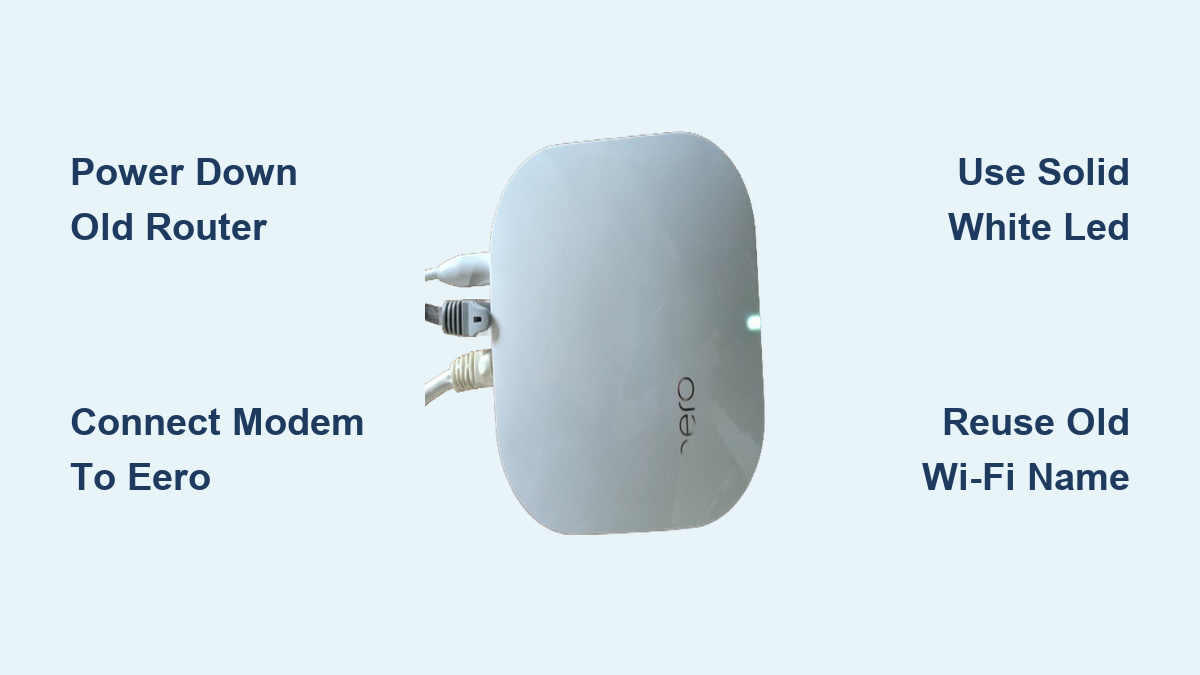This is where most setups fail. Leaving your old router active creates two competing networks that confuse your devices. Your smart TV might connect to the old router while your phone jumps to eero—killing streaming and security cameras. The 30-second power-down ritual eliminates this.
