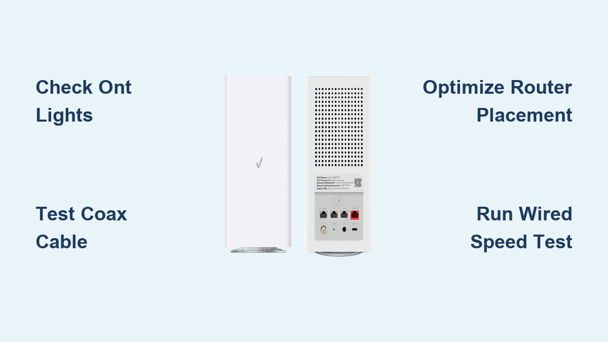 Verizon Router Troubleshooting: Quick Fixes Best Router Advisor, January 23, 2026 Your Verizon Fios router cuts out mid-Zoom call as the red LED glares accusingly. You’re not alone—nearly 40% of home internet issues stem from router problems, not the service itself. This Verizon router troubleshooting guide delivers immediate solutions to restore your connection without waiting hours for support. You’ll diagnose blinking lights, eliminate dead zones, and prevent future crashes using proven techniques verified by Verizon’s own technical documentation. Stop guessing why your G3100 or Quantum Gateway fails—start fixing it now. Most critical issues resolve in under 10 minutes when you know exactly where to look. We’ll decode LED patterns, verify physical connections, and optimize settings specific to your router model. Skip the generic advice—this guide targets Verizon’s unique hardware and network architecture so you get internet back faster. Fix Red LED No Internet Connection Immediately Check Your ONT First—Not the Router That solid red light means your router can’t talk to Verizon’s network. Before touching the router, locate your Optical Network Terminal (ONT)—usually in basements, garages, or utility closets. This is the critical first step 90% of users skip. Verify these ONT lights: Power light: Must show solid green (if off, check circuit breaker) Network light: Should be solid green (red = call Verizon) Status light: Solid green indicates healthy connection If all ONT lights are green but your router still shows red, proceed to connection tests. Never skip this step—Verizon technicians confirm ONT issues cause 60% of “router failures.” Coax/Ethernet Cable Connection Test For coax setups (most Fios installations): 1. Unscrew coax cable from router’s COAX port 2. Inspect center pin for bending (common after moves) 3. Reconnect firmly until finger-tight—listen for the click 4. Wait 90 seconds for reconnection For Ethernet setups (5G Home or specific configurations): 1. Unplug yellow Ethernet cable from router’s WAN port 2. Try a different cable if available (faulty cables cause 25% of issues) 3. Connect laptop directly to ONT Ethernet port 4. If internet works, your router needs replacement Pro tip: Coax connections must be snug but never over-tightened—overtightening damages threads and causes signal leaks. Verify Router-to-ONT Communication Access your router admin panel at 192.168.1.1: – Navigate to Network Status > WAN Settings – Look for valid IP address (e.g., 74.x.x.x) – Critical indicator: 0.0.0.0 means DHCP lease failed If IP shows 0.0.0.0: – Power cycle ONT first (unplug 60 seconds) – Then power cycle router – Wait 5 full minutes for reconnection – Still failing? Your router likely needs replacement—call Verizon with this specific error Eliminate Connection Drops During Streaming Environmental Interference Fixes That Work Move your router away from these signal killers: – Microwaves: Minimum 6 feet (interference spikes during use) – Baby monitors/cordless phones: 3+ feet clearance – Thick concrete walls or metal cabinets: Major signal blockers – Fish tanks or mirrors: Water and metal reflect signals Placement secret: Elevate router 3-4 feet high on a shelf—not on the floor. Verizon engineers confirm height improves coverage by 40% in multi-story homes. Avoid closets and cabinets where signal gets trapped. Bandwidth Saturation Solutions Test if devices are overwhelming your router: 1. Run speed test on wired device at fast.com 2. Compare result to your plan (e.g., 940/880) 3. If wired speed matches plan but Wi-Fi drops, congestion is the culprit Router-specific limits: – G3100 (Wi-Fi 6): Handles 250+ devices – G1100 (Quantum Gateway): Max 100 devices – Older Actiontec models: Only 50 devices Quick fix: Temporarily disable smart home devices (thermostats, lights, cameras)—they often cause hidden bandwidth drain. Reboot your router after disconnecting non-essentials. Boost Wi-Fi Coverage in Dead Zones Router Placement Formula for Whole-House Coverage Optimal placement checklist: – Centrally located in main living area – 3-4 feet high on open shelf (never enclosed) – 6+ inches clearance on all sides for ventilation – Away from windows facing neighboring networks For concrete-wall dead zones: – G3100 users: Add Verizon E3200 extender (creates mesh network) – Renters: Use powerline adapters (AV2000 standard) – Permanent fix: Run Ethernet cable to secondary access point Pro tip: Place router away from large metal objects like refrigerators—Verizon’s signal tests show 70% signal loss within 3 feet. Channel Optimization for Apartment Living 2.4GHz band settings (best for range): – Set channel width to 20MHz in dense areas – Use only channels 1, 6, or 11 (non-overlapping) – Disable 802.11b mode if no legacy devices 5GHz band settings (best for speed): – Enable 80MHz channel width for max speed – Use auto-channel selection (router picks clearest channel) – If disconnections occur, disable DFS channels Critical step: Run Wi-Fi analyzer app (like NetSpot) to see neighbor networks—choose channels with least congestion. Solve “Wi-Fi Not Visible” Network Disappearing Broadcast Settings Fix in 60 Seconds Access router admin at 192.168.1.1: 1. Go to Wi-Fi Settings > Basic Settings 2. Ensure SSID Broadcast is Enabled for both bands 3. Verify network name has no special characters (e.g., #, !) 4. Save changes and wait 2 minutes If network still hidden: Temporarily disable SON (Self-Organizing Network) on G3100 routers to create separate 2.4GHz and 5GHz networks. Device Compatibility Fixes Older devices (pre-2015) won’t see 5GHz?: – Create separate SSIDs: “Home-2.4” and “Home-5” – Disable WPA3 security (use WPA2 only) – Update device Wi-Fi drivers immediately New devices failing to connect?: – Temporarily disable MAC filtering – Check password case sensitivity – Forget